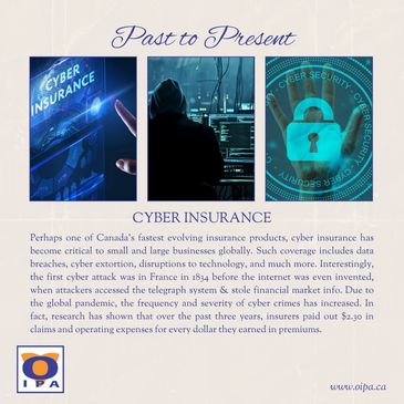 Perhaps one of Canada's fastest evolving insurance products, cyber insurance has become critical to small and large businesses globally. Such coverage includes data breaches, cyber extortion, disruptions to technology, and much more. Interestingly, the first cyber attack was in France in 1834 before the internet was even invented, when attackers accessed the telegraph system & stole financial market info. Due to the global pandemic, the frequency and severity of cyber crimes has increased. In fact, research has shown that over the past three years, insurers paid out $2.30 in claims and operating expenses for every dollar they earned in premiums.