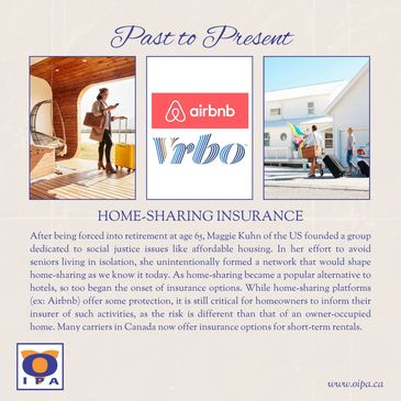 After being forced into retirement at age 65, Maggie Kuhn of the US founded a group dedicated to social justice issues like affordable housing. In her effort to avoid seniors living in isolation, she unintentionally formed a network that would shape home-sharing as we know it today. As home-sharing became a popular alternative to hotels, so too began the onset of insurance options. While home-sharing platforms (ex: Airbnb) offer some protection, it is still critical for homeowners to inform their insurer of such activities, as the risk is different than that of an owner-occupied home. Many carriers in Canada now offer insurance options for short-term rentals.