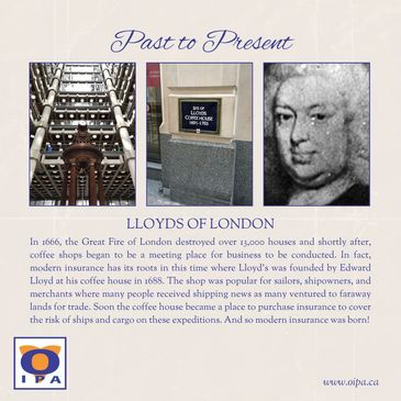 The modern-day Lloyds of London building has some amazing history. The bell in the centre tower is actually salvaged from the first ship insured. The construction of this building was quite intentional, with the utility pipes located on the outside of the building, which allows for maintenance without disruption to the insurance industry. Each floor of this building is filled with Underwriters and representatives of various insurance companies, and every policy that is placed through Lloyds is negotiated in person, in keeping with the tradition of the inception of Insurance.