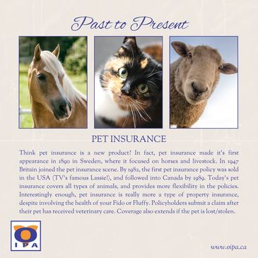 Think pet insurance is a new product? In fact, pet insurance made it's first appearance in 1890 in Sweden, where it focused on horses and livestock. In 1947 Britain joined the pet insurance scene. By 1982, the first pet insurance policy was sold in the USA (TV's famous Lassie!), and followed into Canada by 1989. Today's pet insurance covers all types of animals, and provides more flexibility in the policies. Interestingly enough, pet insurance is really more a type of property insurance, despite involving the health of your Fido or Fluffy. Policyholders submit a claim after their pet has received veterinary care. Coverage also extends if the pet is lost/stolen.