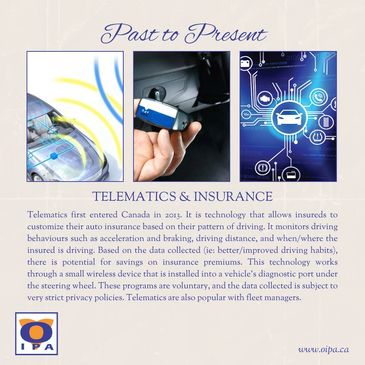 Telematics first entered Canada in 2013. It is technology that allows insureds to customize their auto insurance based on their pattern of driving. It monitors driving behaviours such as acceleration and braking, driving distance, and when/where the insured is driving. Based on